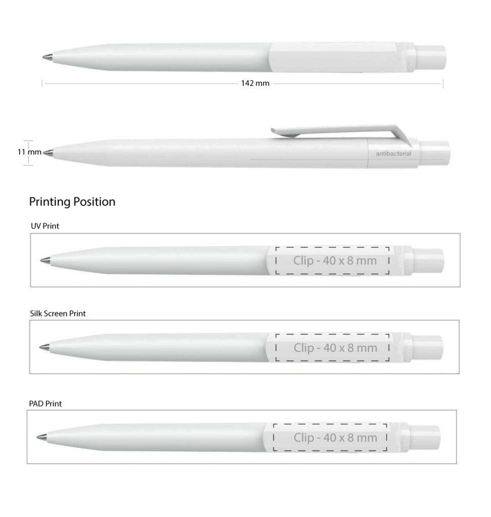 Maxema Dot antibacterial pens are high-quality antibacterial pens. They are crafted with non-toxic and recyclable ABS plastic material. Thus, they are antibacterial. It comes in a solid white color metallic barrel. The whole structure of the pen has a glossy finish. Thus, it gives a shiny metallic look. These pens kill all the bacteria on their surface. Thus, it’s safe for use. It comes with screen printing and UV printing options. Thus, you can customize these cheap printed pens with the logo of your company.