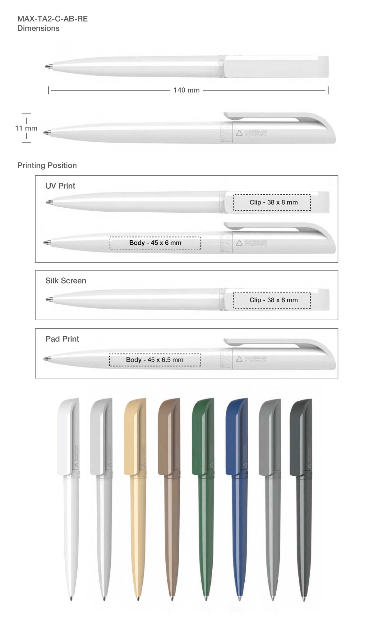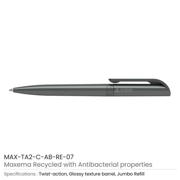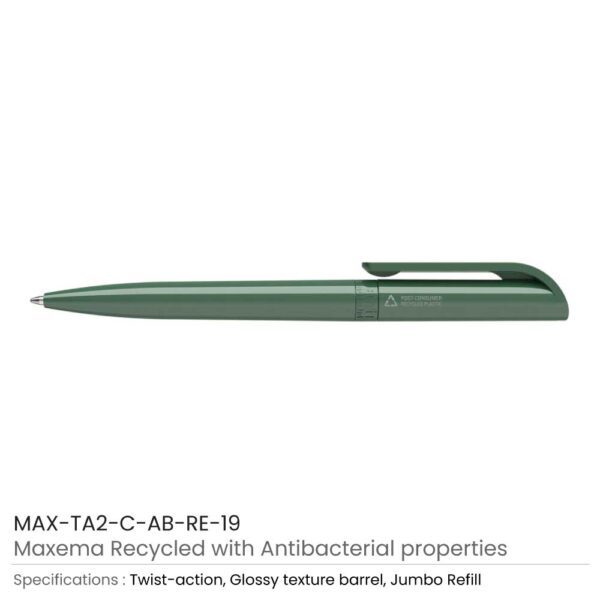 Combines safety, sustainability, and a proven commercial impact! This is a distinctive offering because it is made of recycled plastic with extra specific biocides in the form of silver ions. The words “antibacterial” and the recycling symbol are pre-printed on each pen.
