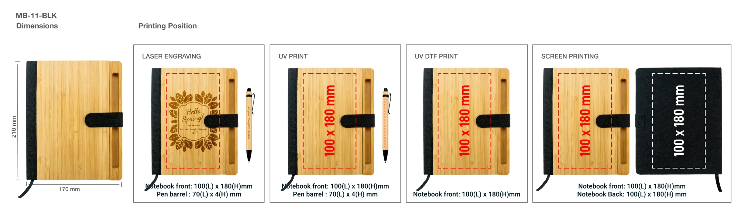 This premium eco-friendly A5 notebook is designed for modern professionals who value sustainability and style. Crafted from a combination of durable bamboo and 300D rPET fabric, it boasts a smooth, natural texture and long-lasting quality. The notebook comes with a matching bamboo pen featuring a black clip and blue ink refill, complemented by 96 lined, cream-colored sheets (70 gsm) for a superior writing experience. A built-in ribbon bookmark helps keep track of pages, while the magnetic clasp closure ensures security with a touch of elegance. Perfect for eco-conscious corporate gifting, promotional events, and daily office use, this notebook blends functionality with an environmentally responsible design.