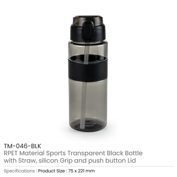 • Design: Transparent black bottle with straw, silicon grip, and push-button lid