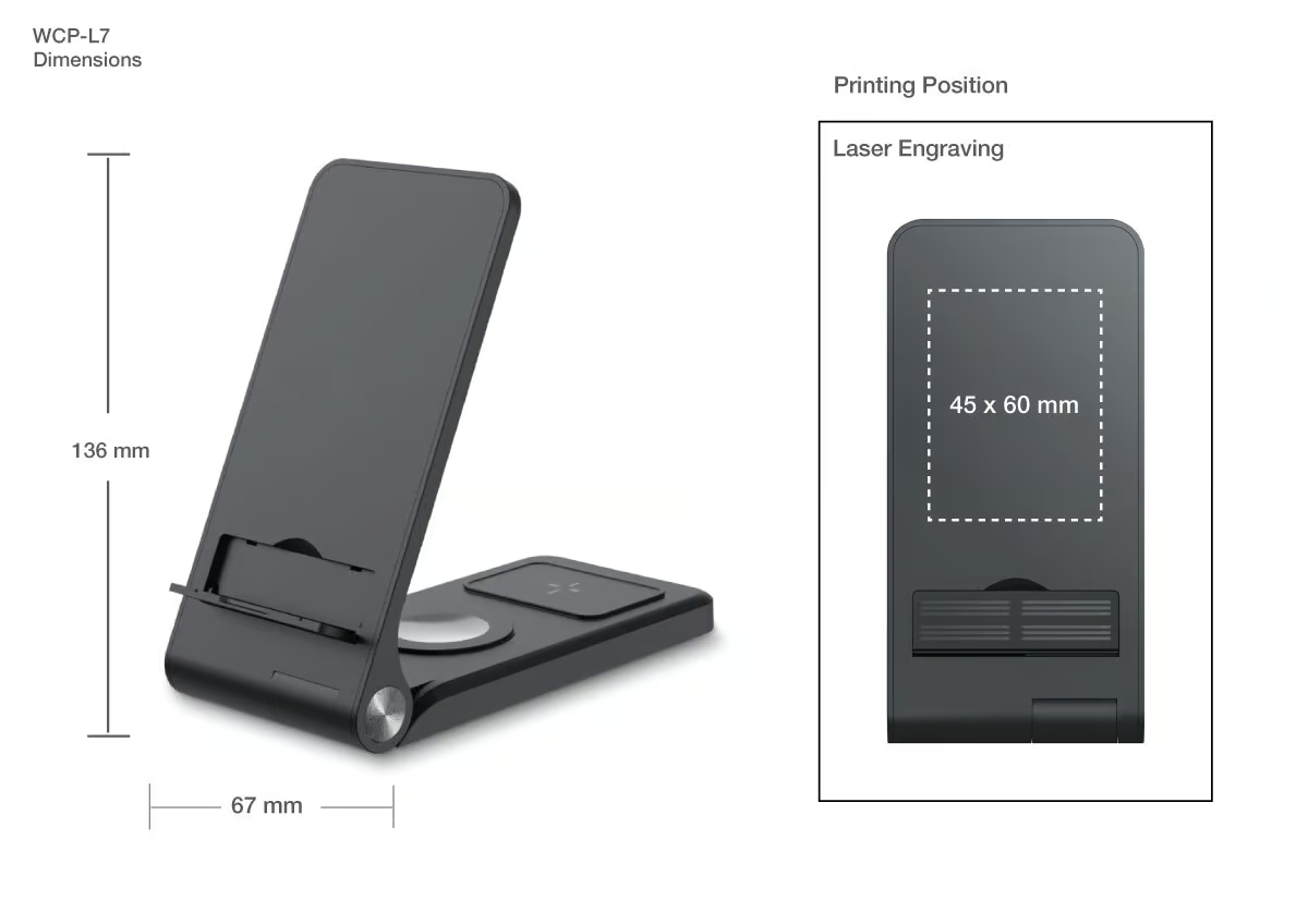 3-in-1 Foldable Wireless Charging Station for phones, smartwatches, and earbuds, wireless output 15W & Light-up Logo option.