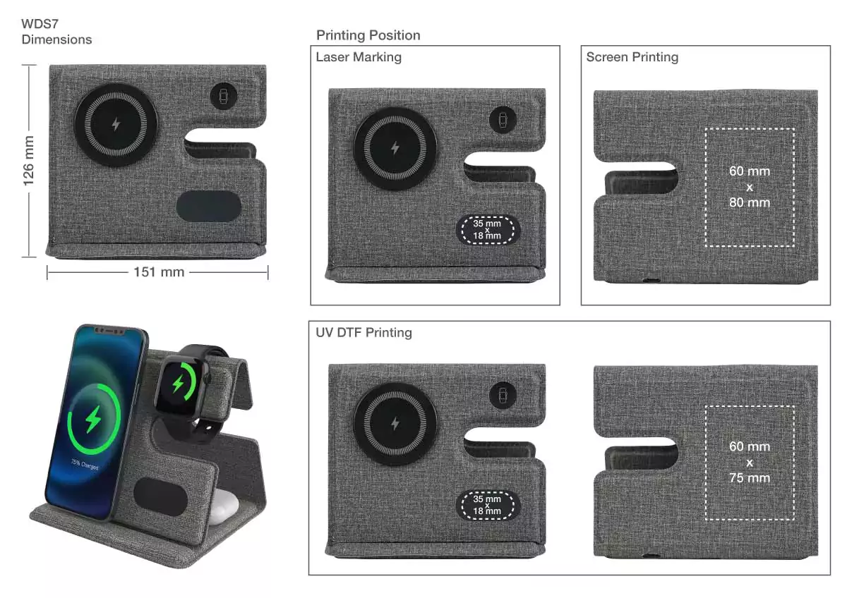 - Multi-charging area: Phone, Watch, Earbuds