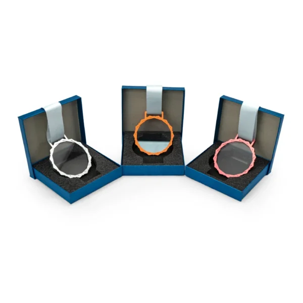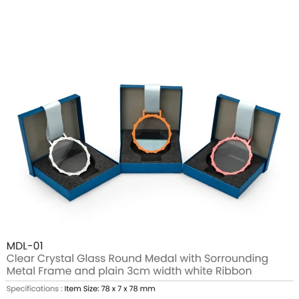 The premium round clear crystal glass medals are encased in a sleek metal frame, available in Indochine Gold, Silver, and Coral Red finishes. Comes with a plain white 3cm-wide ribbon and is packed in an elegant, blue-textured presentation box with black foam.