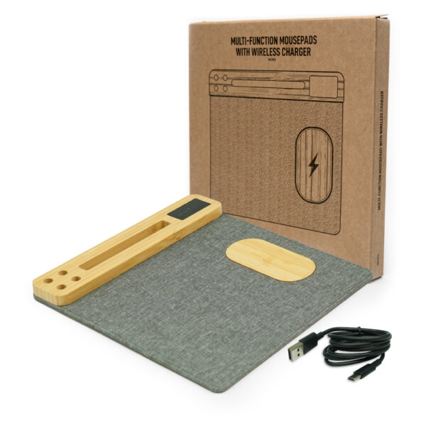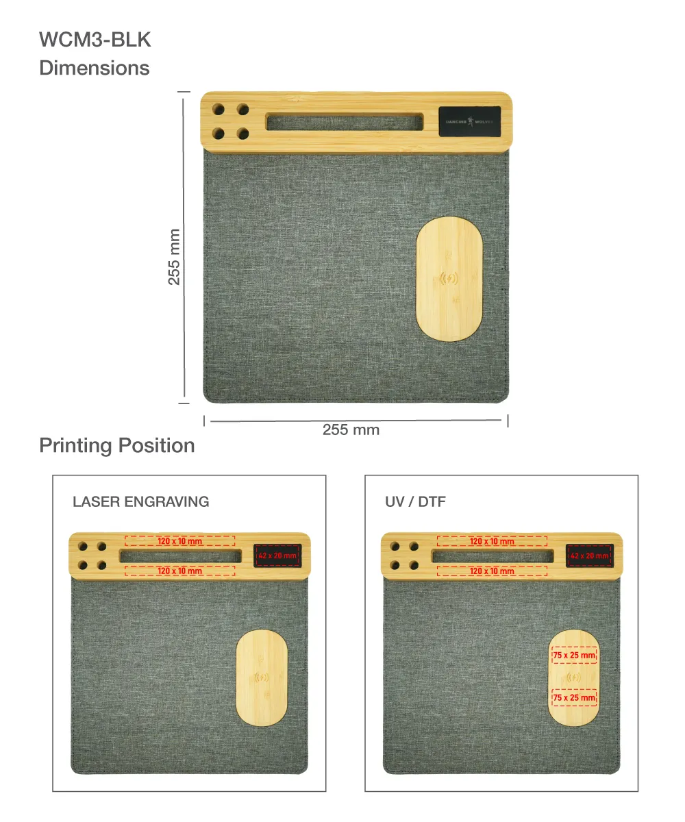 Mousepad with wireless charger made from Polyester Fabric base and features a bamboo organizer that includes a phone holder, pen holder, and a card slot. Stylish and practical, it combines productivity with tech-friendly functionality.