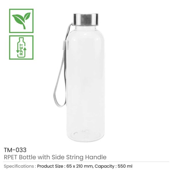 RPET Bottles 550ml with SS Lid and Side String Handle – Transparent Color.