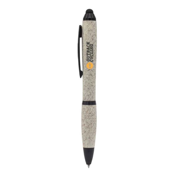 Introducing to you our 2-in-1 wheat straw pen which performs two different functions. It had created with eco-friendly wheat straw material. This multi-functional pen comprises a brown cork barrel with a black polypropylene ring in the middle. Apart from the barrel, it comprises a black tip and clip Thus, it’s a perfect promotional pen with a stylus. This promotional eco-friendly pen with a stylus is so lightweight. Thus, you can easily hold it.