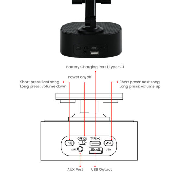 • Inside the box: (1) wireless charger speaker unit (1) Type-C Black Charging cable (1) user manual
