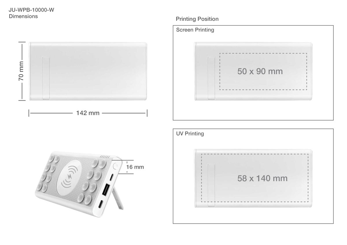 Power bank with a 10000 mAh lithium polymer battery that is flat and robust. Strong suction pads on the power bank allow it to fit perfectly on your mobile device and charge it wirelessly without cords. You can charge your mobile device using a conventional USB connector, a Type-C port, and a wireless charger.